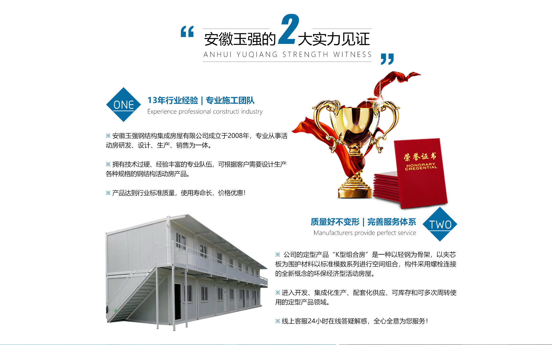 安徽玉強(qiáng)鋼結(jié)構(gòu)集成房屋有限公司是一家集研發(fā)、設(shè)計(jì)、生產(chǎn)、銷售服務(wù)于一體的活動(dòng)房與集裝箱制造企業(yè),公司隊(duì)伍具有多年鋼結(jié)構(gòu)制作及產(chǎn)品檢測經(jīng)驗(yàn),嚴(yán)格按照鋼結(jié)構(gòu)標(biāo)準(zhǔn)要求制作、檢測。致力于提供研、產(chǎn)、銷、于一體,有著多年積累的先進(jìn)生產(chǎn)技術(shù)和豐富工作經(jīng)驗(yàn),采用精良的工藝技術(shù),生產(chǎn)美觀大方的定型產(chǎn)品,長期以來,受廣大用戶的信賴和支持。歡迎您的來電咨詢。